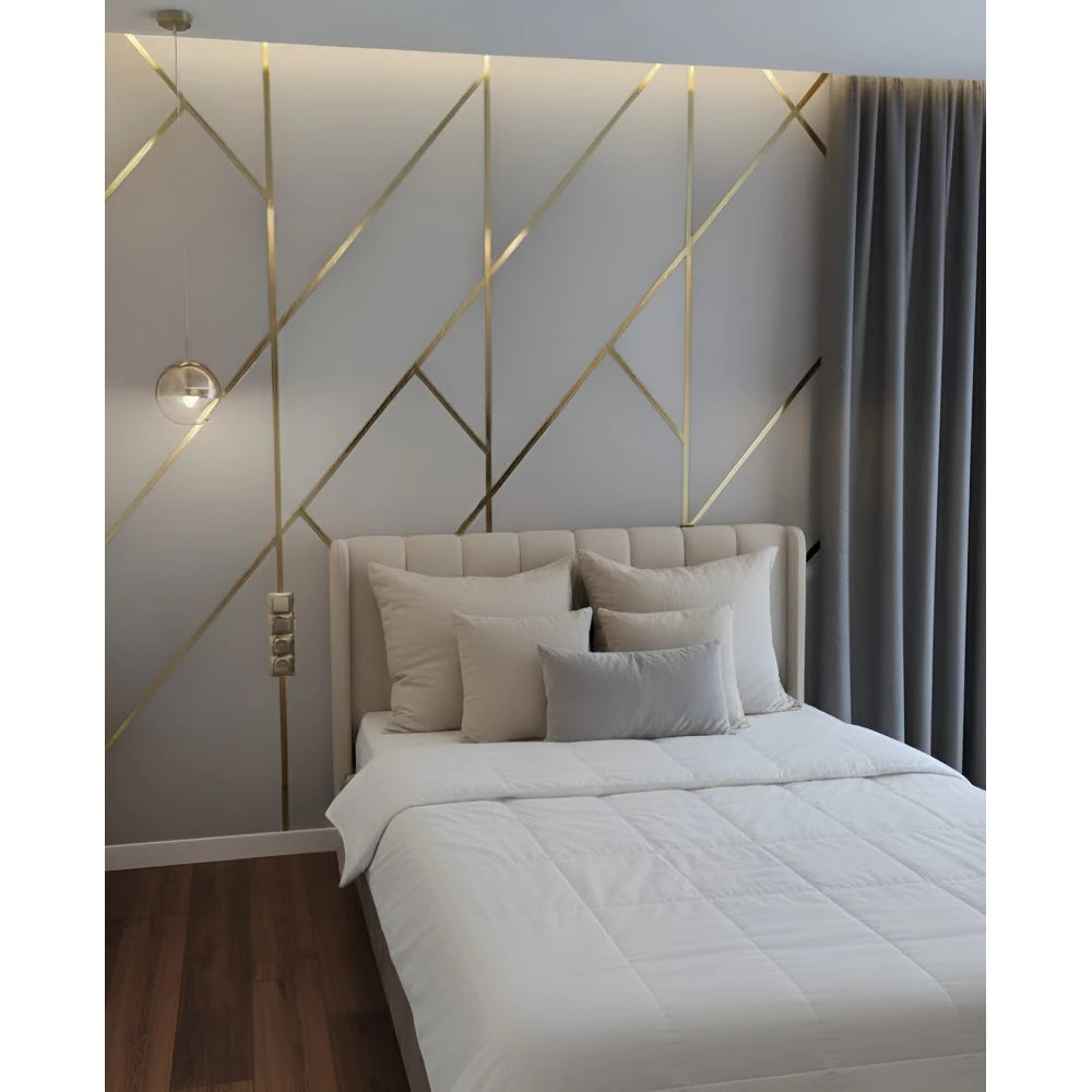 Montajul se face cu adeziv potrivit suportului, pe suprafete plane si curate. In bai, dusuri, bucatarii, holuri si zone comerciale functioneaza ca profil decorativ sau profil de trecere intre vopsea, tapet, microciment, lemn si ceramica. Aspectul auriu mat aduce caldura controlata in scheme moderne, contemporane, japandi, modern clasic ori industrial soft, unde liniile metalice subtiri ordoneaza compozitia. Platbanda ofera posibilitatea de a urmari curbe usoare pentru continuitate vizuala.